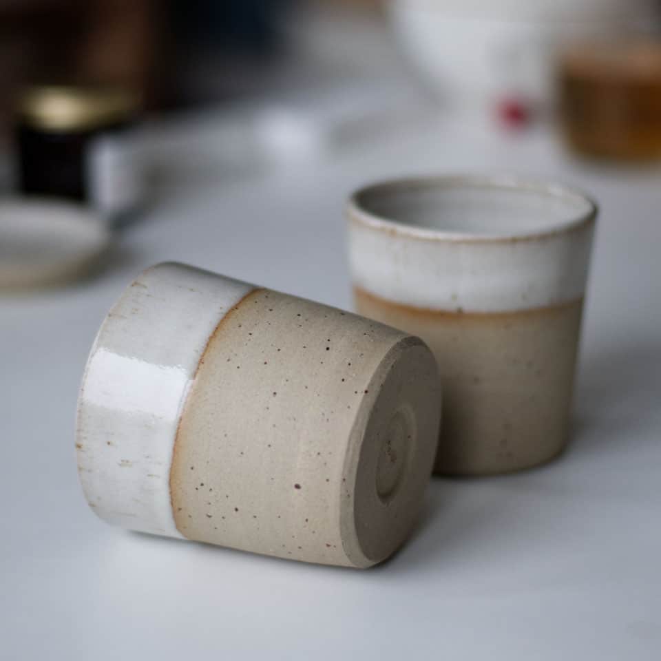 Een beker met wit glazuur waarbij de buitenzijde grotendeels ongeglazuurd is. Hij is ideaal als theebeker of voor een cappuccino of latte. De klei is een mengeling van verschillende steengoed kleisoorten. De lichte spikkel in de klei reageert met het glazuur waardoor het mooie effecten geeft.