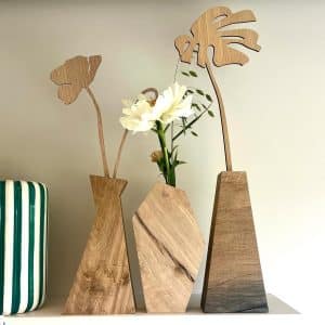 Deze vazen worden gemaakt van resthout. Een meubelmaker kapt zelf zijn boom en maakt daar planken van. Het hout wat over blijft nadat hij er meubelen van gemaakt heeft, wordt gebruikt om deze vazen te maken. De vazen zijn in drie verschillende vormen verkrijgbaar triangle, classic en A-line. Iedere vaas is uniek. Door het gebruik van resthout kan de dikte variëren tussen de 6 en 8 cm. De vazen hebben een glazen buisje waar je jouw mooiste bloemen in kan zetten.