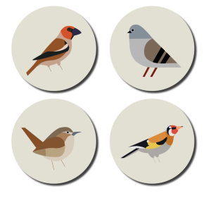 Onderzetters met vogeltjes, appelvink, duif, winterkoning en putter.
